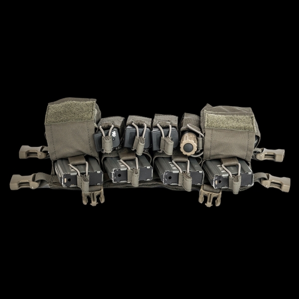 The rig intentionally does not include a radio or dedicated full size medical pouch so no matter the posture, essentials such as communications and medical kits can remain on the end user at all times.