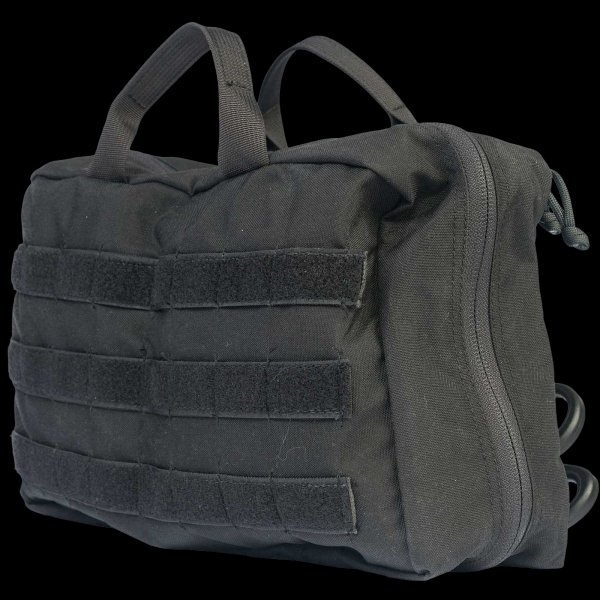 One side of the bag's exterior includes trauma shears at the ready as well as several pairs of nitrile gloves, while the opposite side features a MOLLE-style system to accommodate extra equipment as needed, such as additional tourniquets, ammo, or personal protective equipment. This arrangement is ideal for customizing the carriage of gear that requires immediate access.